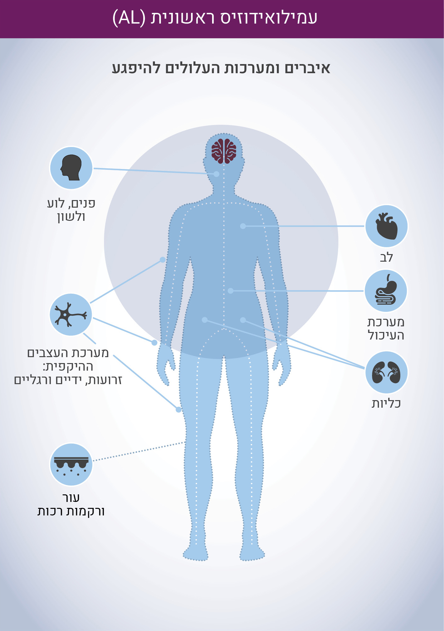 עמילואידוזיס מסוג AL, הנקראת גם עמילואידוזיס ראשונית, היא מחלת דם, קשה לאבחון ושהטיפול המוקדם בה חשוב ביותר. המחלה נגרמת בגלל פגם בתפקוד תאים במח העצם הנקראים תאי פלסמה, תאים האחראים על יצירת נוגדנים. חלק מתאי הפלסמה פגומים וגורמים ליצירת חלבונים לא תקינים. החלבונים הפגומים הנקראים שרשראות קלות של נוגדנים, (Free Light Chains – FLC) נודדים בגוף, שוקעים ומצטברים באיברים שונים וגורמים לתפקוד לקוי של איברים אלה. החלבונים הפגומים עלולים לשקוע ולהשפיע על איבר בודד או על מספר איברים. האיברים המושפעים ביותר בעמילואידוזיס מסוג AL כוללים את הלב, הכליות, מערכת העצבים ומערכת העיכול. מטרת הטיפול בעמילואידוזיס AL היא עצירת יצור החלבונים הלא תקינים בתאי הפלסמה על ידי חיסול תאי הפלזמה הפגומים האחראים ליצירתם. ללא טיפול המחלה יכולה להיות חמורה ואף קטלנית, כאשר שיעור ההישרדות משתנה מחולה לחולה, אך טיפול נכון ובמיוחד אם היה אבחון בשלבים מוקדמים, יכול להעניק שנות חיים ארוכות ואיכות חיים טובה.